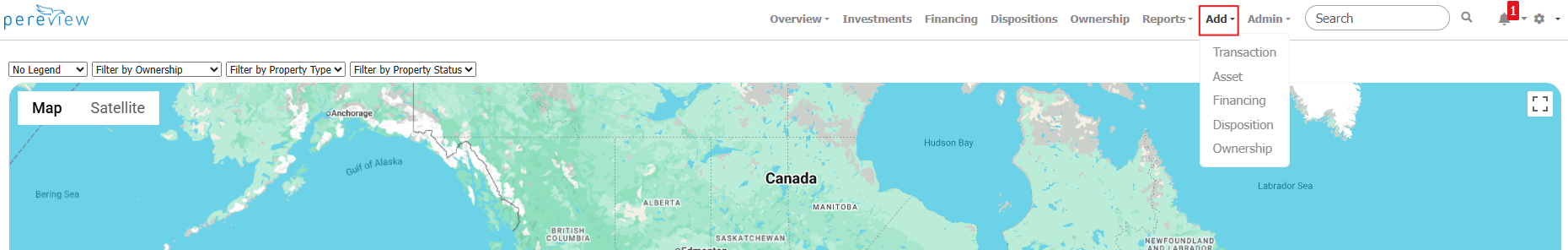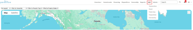 Located in the top nav bar, the Add dropdown menu allows you to quickly add Transactions, Assets, Financings, Dispositions, and Ownerships.