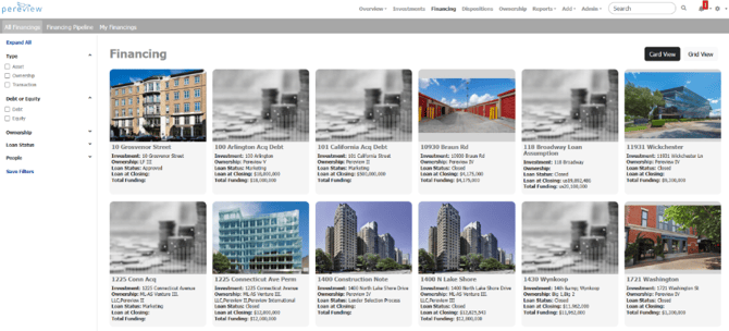 Financings can be viewed either in card view or grid view, which can be toggled via the associated buttons in the upper right-hand corner of the screen. Clicking on any of the displayed financings will open that specific financing page.