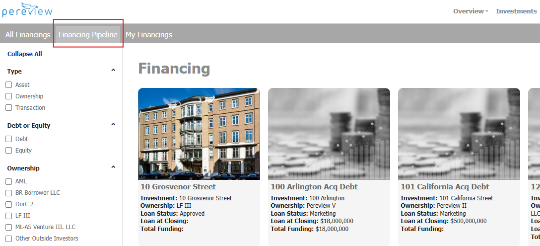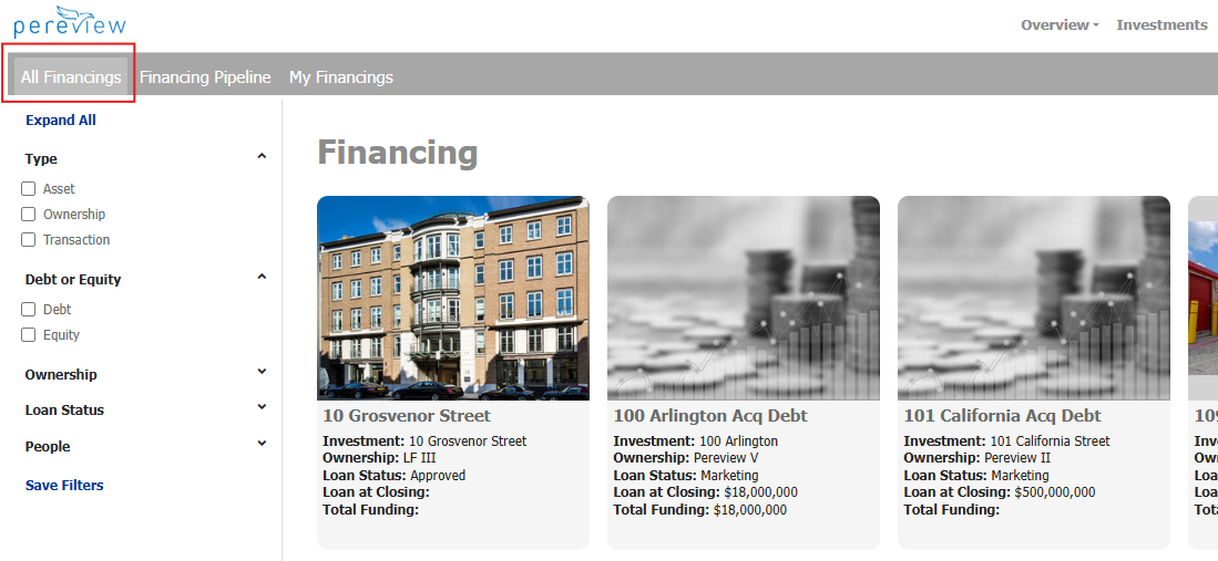 My Financings tab will only display financings for which you have been assigned a role within Pereview.