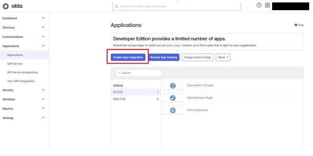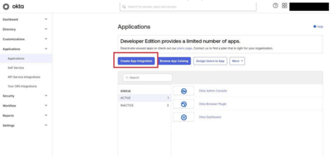 - Log in to Okta and select Applications from the left nav menu. Then select the blue button labeled “Create App Integration.”