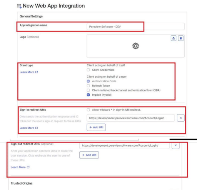 3. Afterselecting Next, Okta will ask you to give the application a name, set the grant type, and then set the URLs. The URLS should correspond to your Pereview database URL.