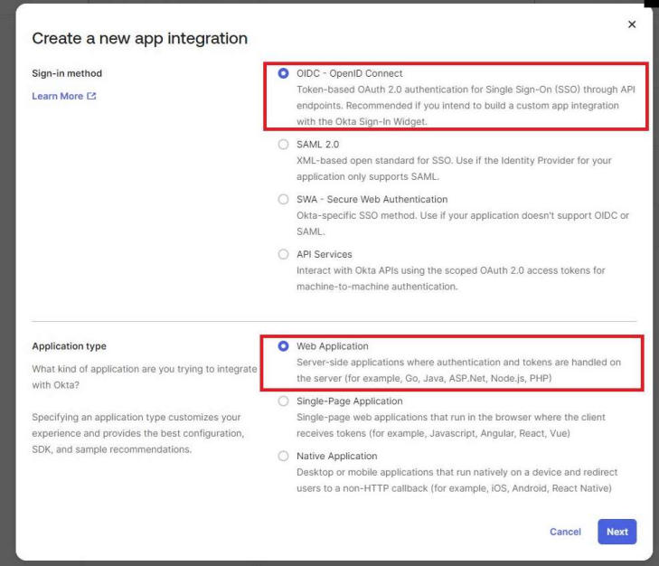 2. A popup will appear and ask you to select the sign in method and the Application type. Pereview OIDC is considered a web application.