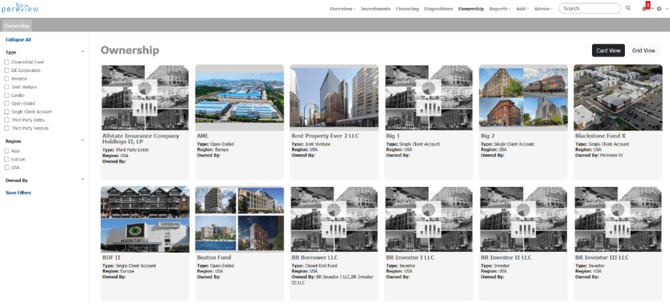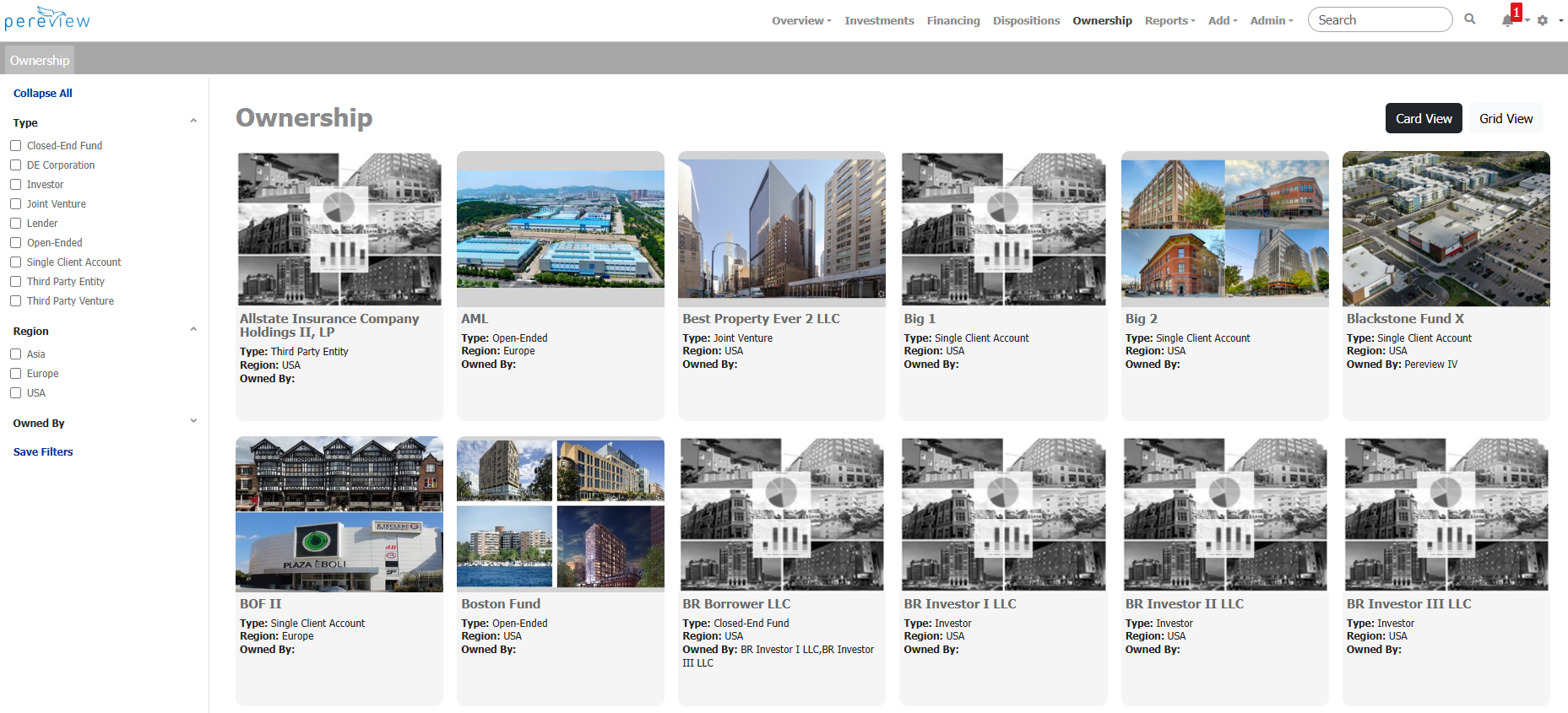 Ownerships can be viewed either in card view or grid view, which can be toggled via the associated buttons in the upper right-hand corner of the screen. Clicking on any of the displayed ownerships will open that specific Ownership page.