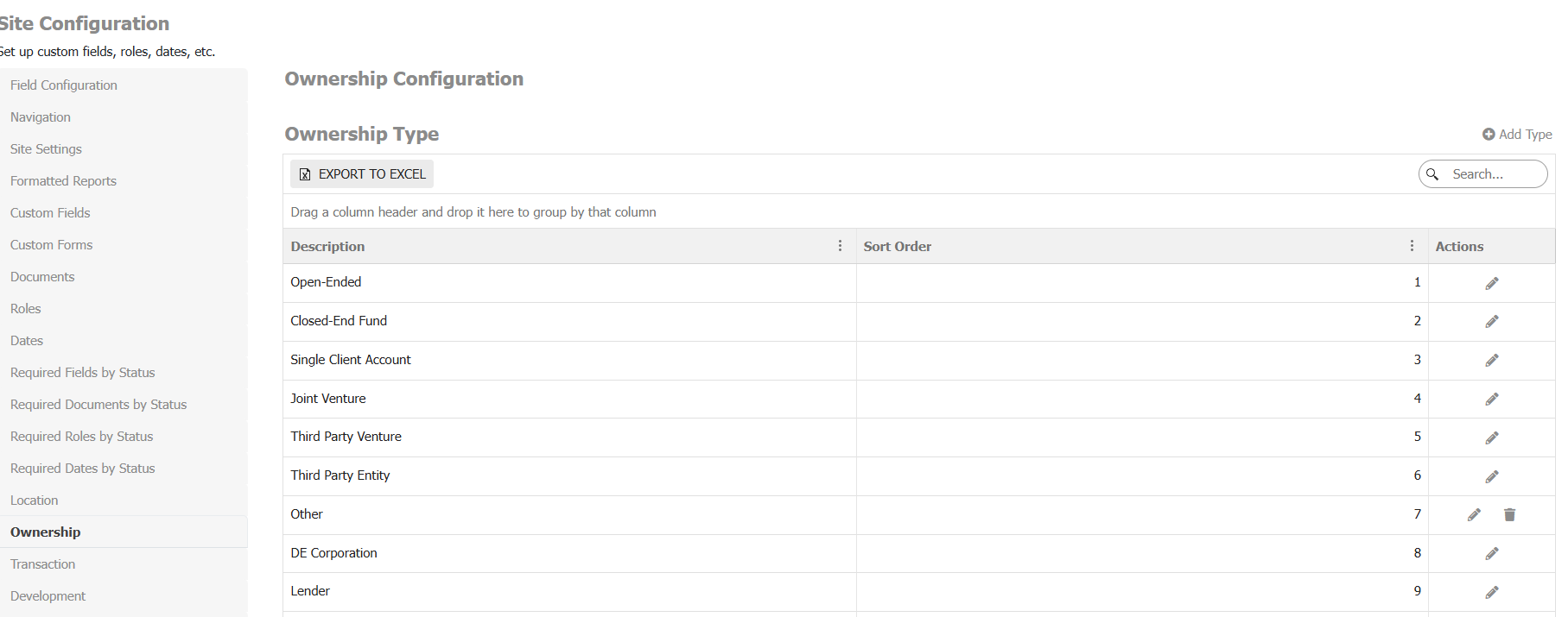Under the Ownership section, users can view and manage Ownership Types and their various associated options and formats. Navigate to this section via Admin in the top nav bar, site and then Ownership in the left hand nav pane.
