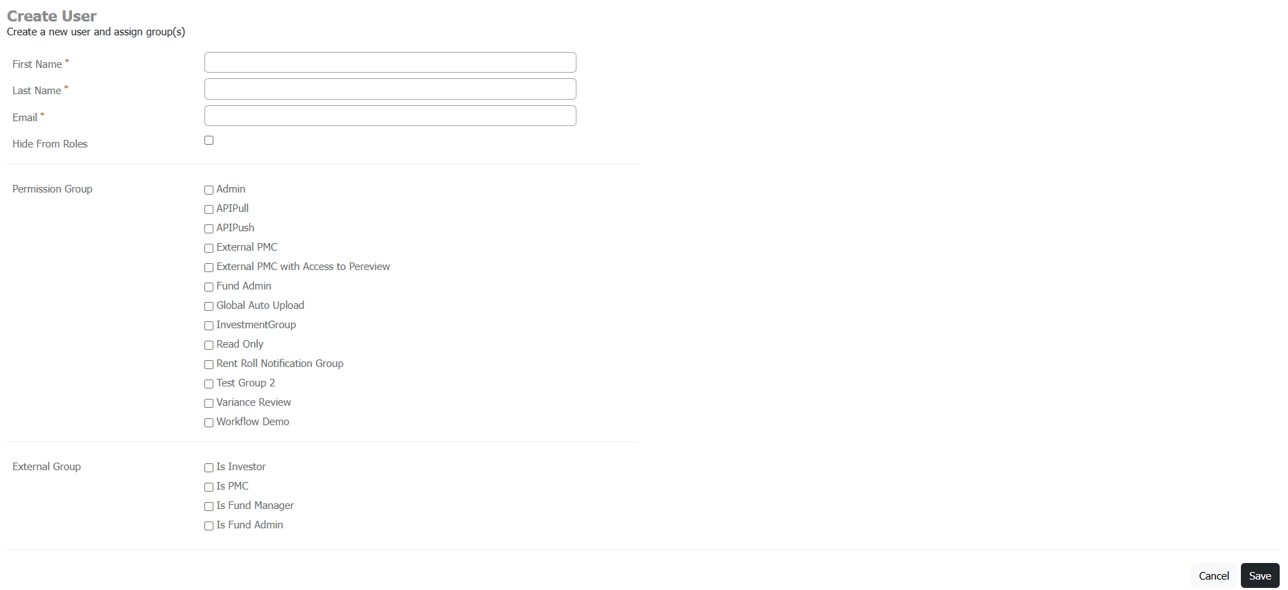 - External Group: If a user is either an Investor or Property Management Company, apply the appropriate group to limit their visibility into the application